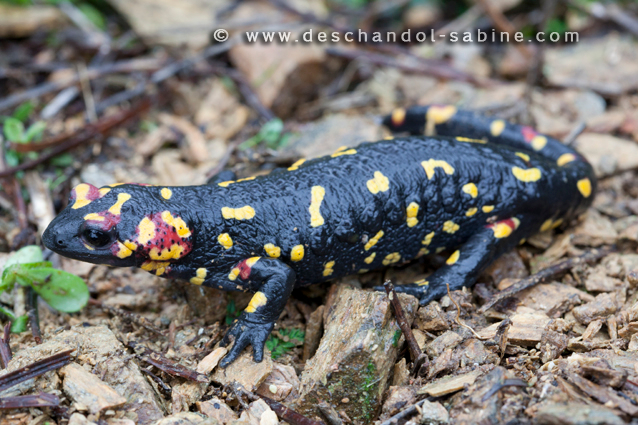 : Salamandre tachetée (Salamandra salamandra morenica), Jabugo, Espagne.