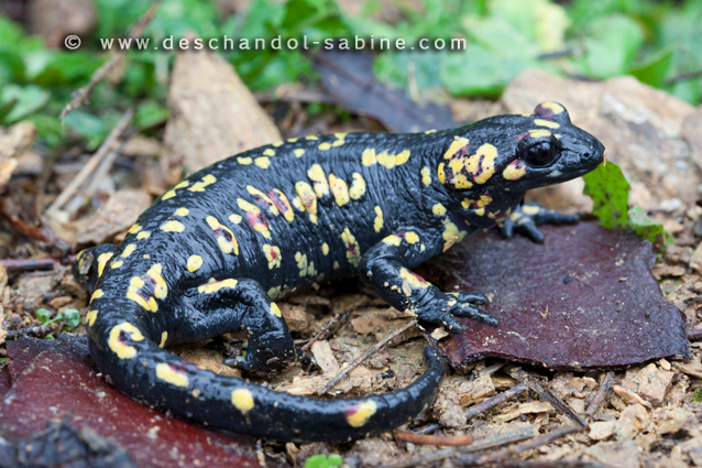 : Salamandre tachetée (Salamandra salamandra morenica), Jabugo, Espagne.