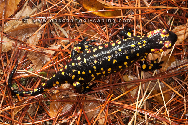 : Salamandre tachetée (Salamandra salamandra morenica), femelle gravide, Almonaster la Real, Espagne.