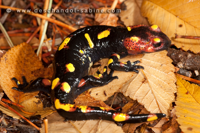 : Salamandre tachetée (Salamandra salamandra morenica), Almonaster la Real, Espagne.