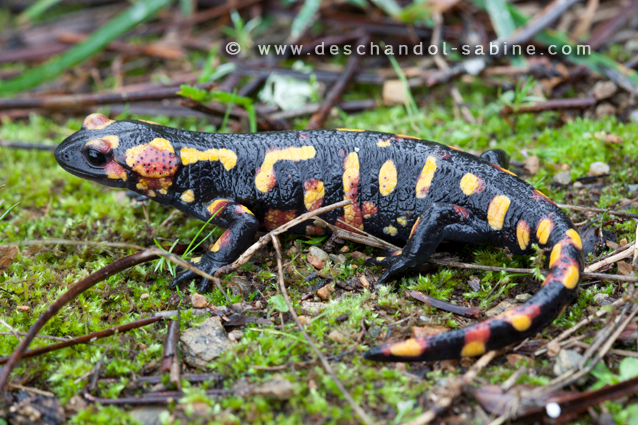 : Salamandre tachetée (Salamandra salamandra morenica), Jabugo, Espagne.