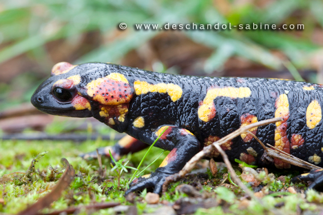 : Salamandre tachetée (Salamandra salamandra morenica), Jabugo, Espagne.