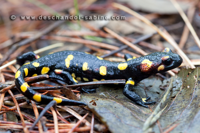 : Salamandre tachetée (Salamandra salamandra morenica), subadulte, Cazalla de la Sierra, Espagne.