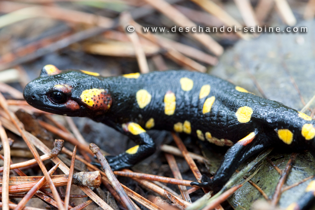 : Salamandre tachetée (Salamandra salamandra morenica), subadulte, Cazalla de la Sierra, Espagne.
