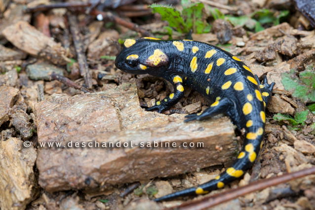 : Salamandre tachetée (Salamandra salamandra morenica), jeune, Jabugo, Espagne.