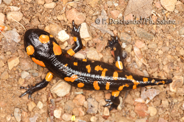 : Salamandre tachetée (Salamandra salamandra morenica), jeune, Cazalla de la Sierra, Espagne.