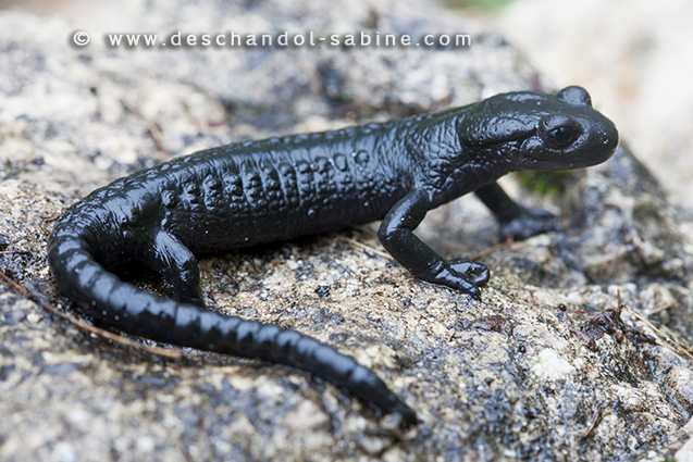 : Salamandre noire (Salamandra atra pasubiensis), Monte Pasubio, Italie.