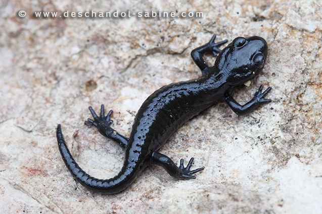 : Salamandre noire (Salamandra atra pasubiensis), juvénile, Monte Pasubio, Italie.