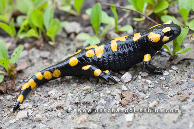 : Salamandra tachetée (Salamandra salamandra salamandra), subadulte, Slunj, Croatie.