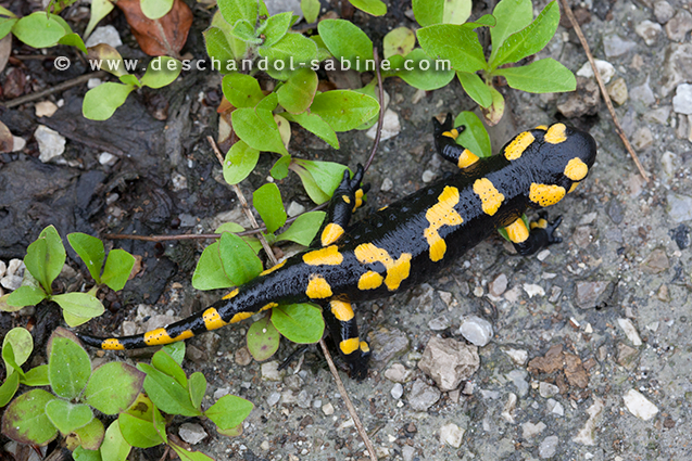 : Salamandra tachetée (Salamandra salamandra salamandra), subadulte, Slunj, Croatie.