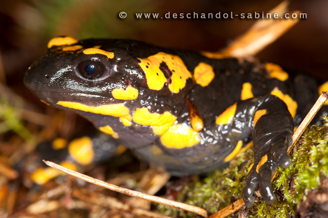 : Salamandra tachetée (Salamandra salamandra salamandra), femelle gravide, Plitvice, Croatie.