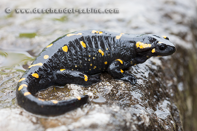 : Salamandra tachetée (Salamandra salamandra salamandra), femelle gravide, Slunj, Croatie.