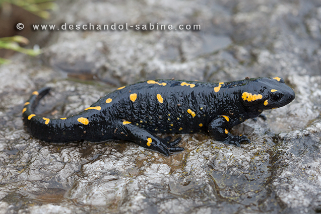 : Salamandra tachetée (Salamandra salamandra salamandra), femelle gravide, Slunj, Croatie.