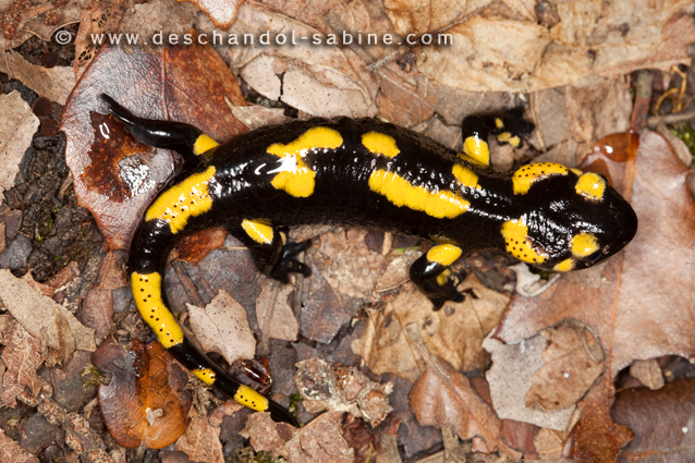 : Salamandre tachetée (Salamandra salamandra terrestris), subadulte, Montseny, Espagne.