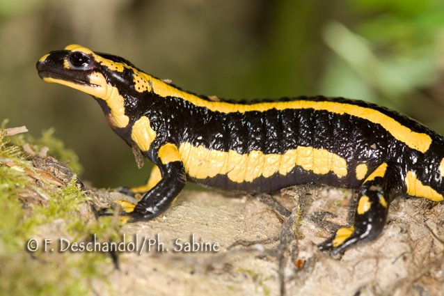 : Salamandre tachetée (Salamandra salamandra terrestris), femelle gravide, Fontaine St Fiacre (27), France.