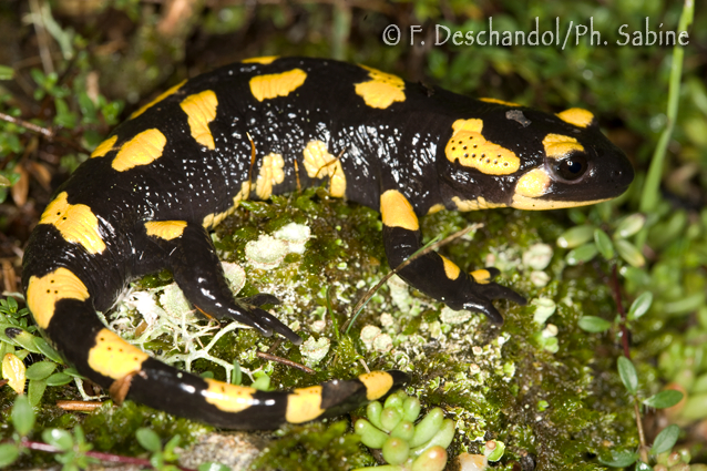 : Salamandre tachetée (Salamandra salamandra terrestris), Saxel (74), France.