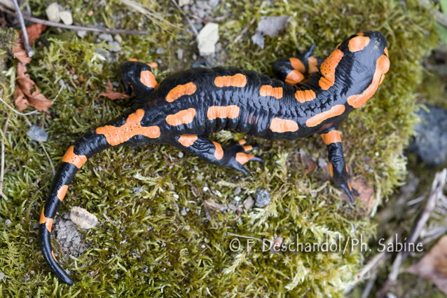 : Salamandre tachetée (Salamandra salamandra terrestris), forme orange, Notre Dame des Landes (44), France.