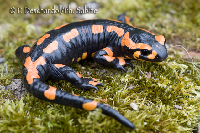 : Salamandre tachetée (Salamandra salamandra terrestris), forme orange, Notre Dame des Landes (44), France.