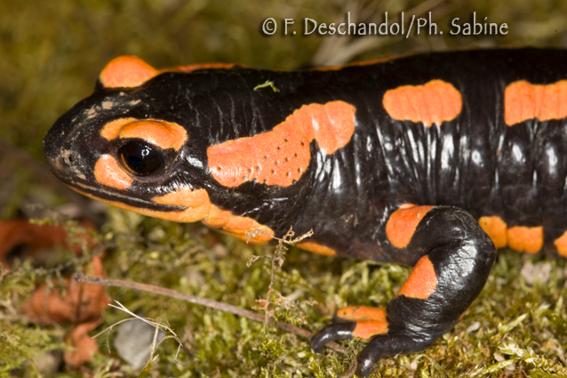 : Salamandre tachetée (Salamandra salamandra terrestris), forme orange, Notre Dame des Landes (44), France.