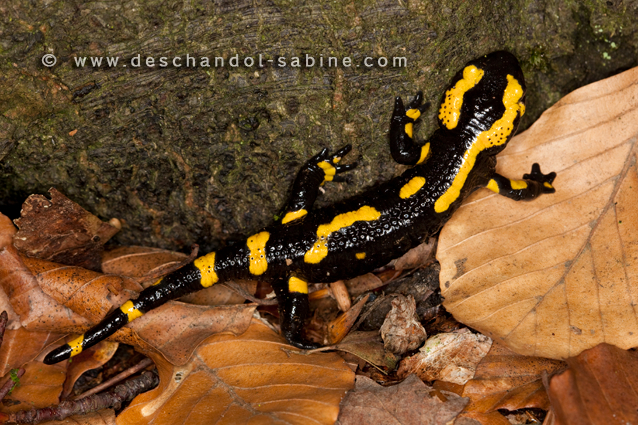 : Salamandre tachetée (Salamandra salamandra terrestris), juvénile, Bruxelles, Belgique.