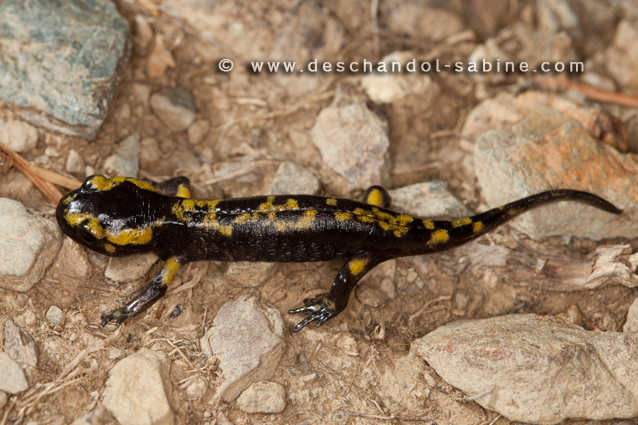 : Salamandre tachetée (Salamandra salamandra terrestris), juvénile, Jujols (66), France.