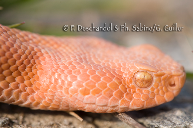 : Vipère aspic (Vipera aspis aspis), femelle albinos, Blain (44), France. Découverte : Gaëtan Guiller