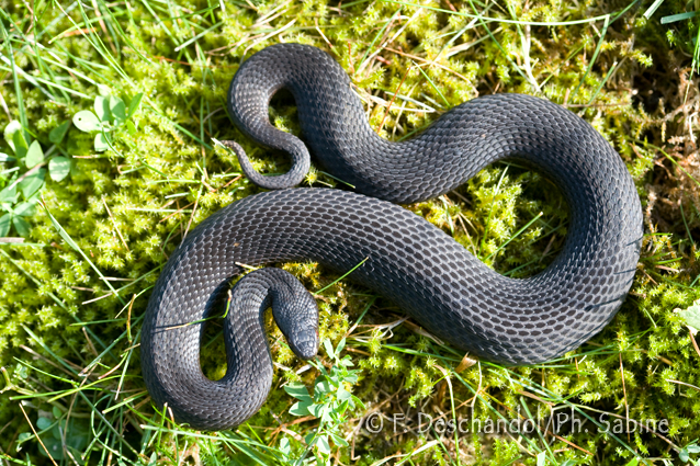: Vipère péliade (Vipera berus berus), forme mélanique, femelle gravide, Pontarlier (25), France.