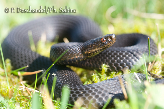 : Vipère péliade (Vipera berus berus), forme mélanique, femelle gravide, Pontarlier (25), France.