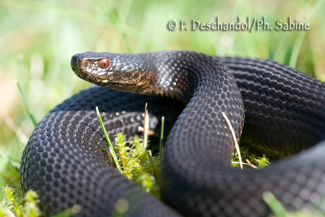 : Vipère péliade (Vipera berus berus), forme mélanique, femelle gravide, Pontarlier (25), France.