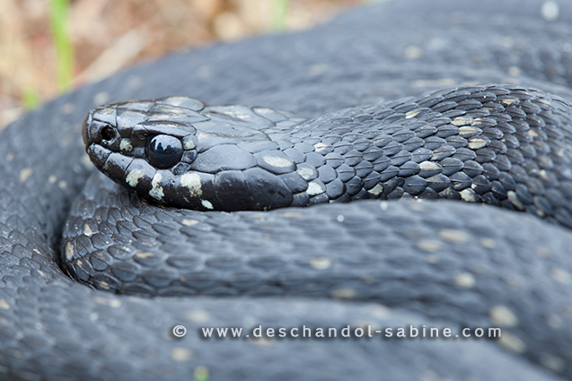: Couleuvre à collier (Natrix natrix corsa), forme mélanique, Portigliolo, Corse, France.