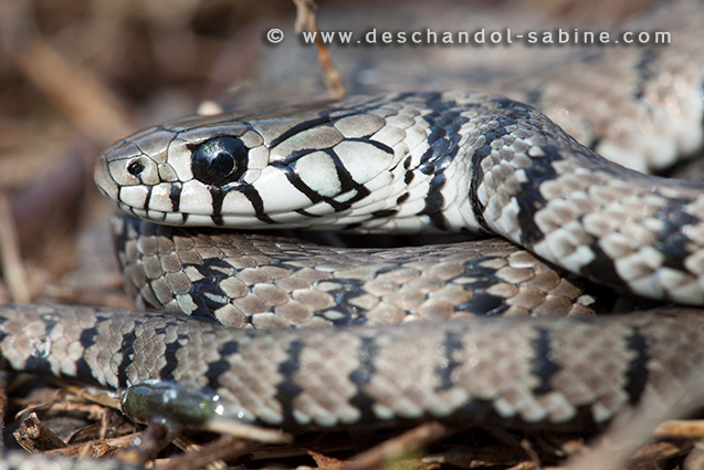 : Couleuvre à collier (Natrix natrix corsa), jeune, Portigliolo, Corse, France.