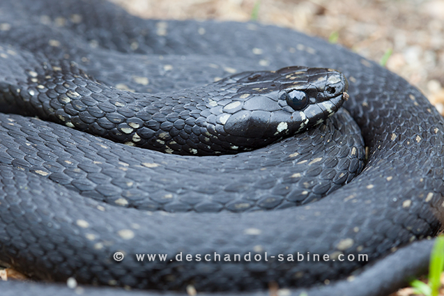 : Couleuvre à collier (Natrix natrix corsa), forme mélanique, Portigliolo, Corse, France.