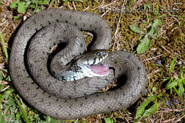 : Couleuvre à collier (Natrix natrix helvetica), femelle, simulation de mort, Larrau (64), France.