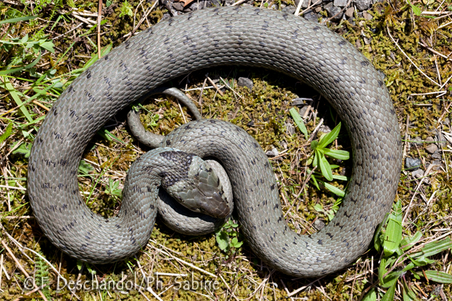 : Couleuvre à collier (Natrix natrix helvetica), femelle, Larrau (64), France.