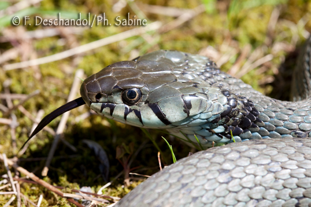 : Couleuvre à collier (Natrix natrix helvetica), femelle, Larrau (64), France.