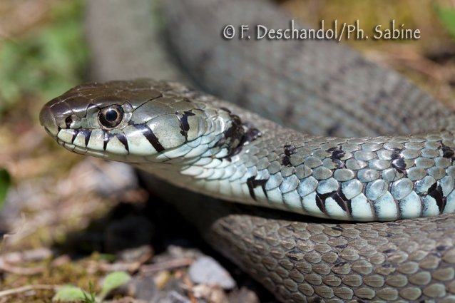 : Couleuvre à collier (Natrix natrix helvetica), femelle, Larrau (64), France.