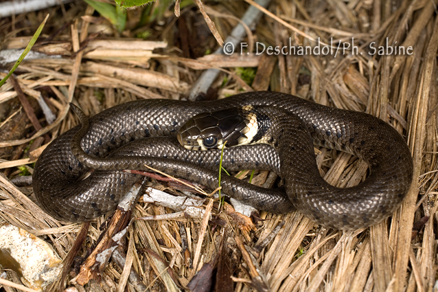 : Couleuvre à collier (Natrix natrix helvetica), jeune venant d'éclore, Sandouville (76), France.