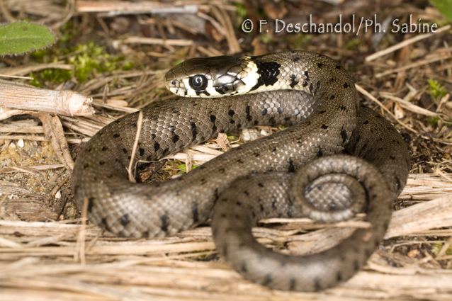 : Couleuvre à collier (Natrix natrix helvetica), jeune venant d'éclore, Sandouville (76), France.