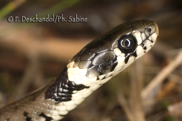 : Couleuvre à collier (Natrix natrix helvetica), jeune venant d'éclore, Sandouville (76), France.