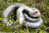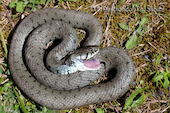 Couleuvre à collier (Natrix natrix helvetica), simulation de mort, Sandouville (76), France.