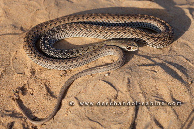 : Couleuvre de Montpellier (Malpolon monspessulanus), Mazagon, Espagne.