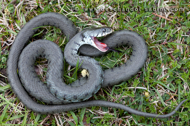 : Couleuvre à collier (Natrix natrix natrix), simulation de mort, Asiago, Italie.