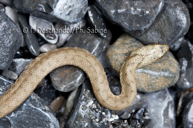 : Couleuvre tesselée (Natrix tessellata), juvénile, Lac Léman, Suisse.