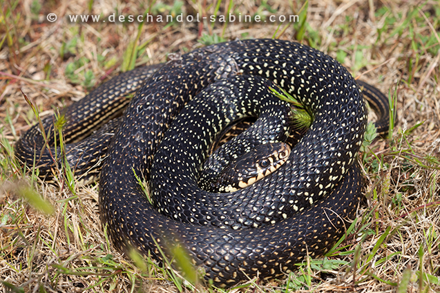: Couleuvre verte et jaune (Hierophis viridiflavus viridiflavus), Portigliolo, Corse.
