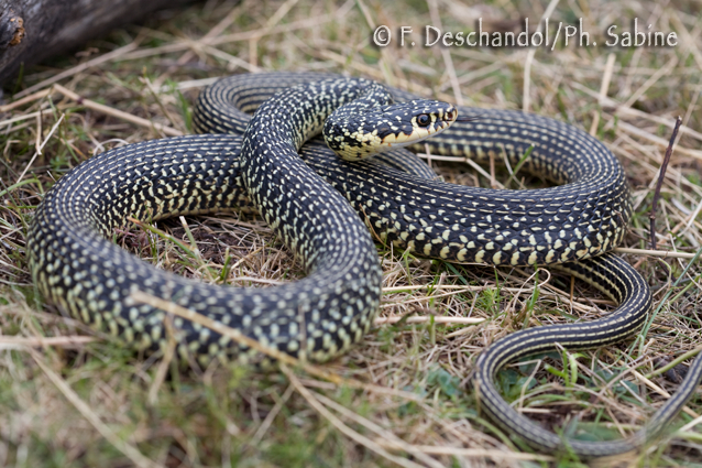 : Couleuvre verte et jaune (Hierophis viridiflavus viridiflavus), mâle, Mont Ventoux (84), France.