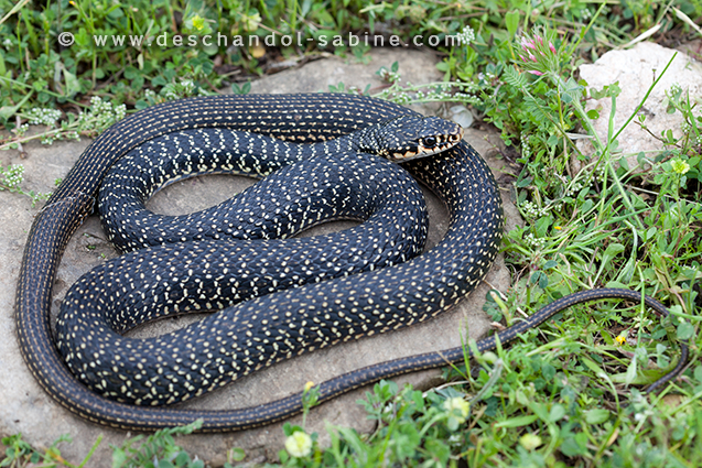 : Couleuvre verte et jaune (Hierophis viridiflavus viridiflavus), Nuoro, Sardaigne.
