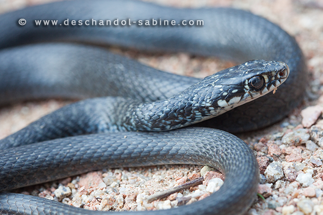 : Couleuvre verte et jaune (Hierophis viridiflavus viridiflavus), forme mélanique, Sette Fratelli, Sardaigne.
