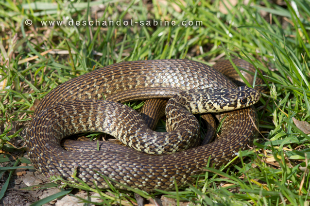 : Couleuvre verte et jaune (Hierophis viridiflavus viridiflavus), subadulte, Parc de la Brenne (36), France.