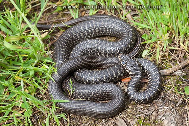 : Couleuvre verte et jaune (Hierophis viridiflavus viridiflavus), Portigliolo, Corse.
