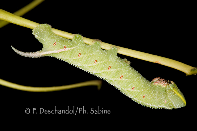 : Sphinx demi-paon (Smerinthus ocellatus atlanticus), chenille 5ème stade, forme gris-bleue, Aït-Mhammed, Maroc.